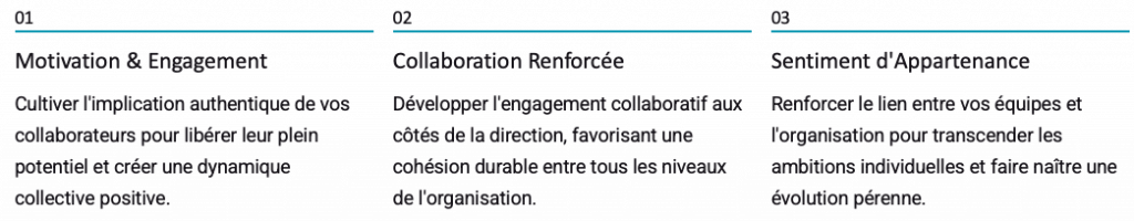 Développer l’engagement collaboratif aux côtés de la direction, favorisant une cohésion durable entre tous les niveaux de l’organisation.